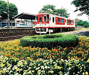ホーム前に植えられている花が、列車を待つ乗客を和ませる終点・八百津。