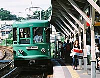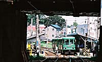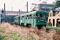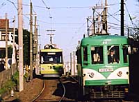 | 山下付近で300形と擦れ違 う玉電カラーの82-81。 |