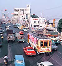玉川線最後の日に、「さようなら玉電」の装飾電車となった60形65が、国道246号線上を駒沢から真中へ向かう。 '69.5.10