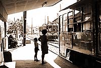 道玄坂上から国道246号線上を通ってきた玉川線は、駒沢〜新町間で旧玉川通りに入り、桜新町・用賀を経て瀬田へと向かっていた。桜新町から先は専用軌道で、用賀駅には屋根つきのプラットホームがあり、玉電に風情を添えていた。写真は用賀駅ですれ違う80形同士。 '69.5.3
