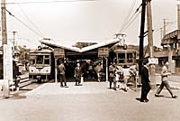 二子玉川園駅に並ぶ右5番線が渋谷行き80形103。左側6番線が砧行き60形64。画面右の田園都市線の高架の下に、同線から分かれて降りてきた建設中の新玉川線の新しい線路が見える。現在、この跡地には東急ストアが建つ。 '69.5.3