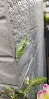 我が家には柑橘系の木はありません。ただ、玄関先には花が多くアゲハチョウがたびたび飛来して来ていました。よりによって外 壁にサナギが付くとは思っても居ませんでした。