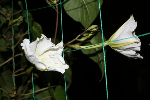 白色ユウガオはここ数年ほど連続して栽培しています。どうも温度の加減で咲かないのだと経験上分かったので、昨年は夕方に噴霧器を使って葉を湿らせ気化熱で温度を下げようと試みたのですが、ダメでした。