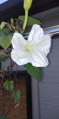 花は大きな方で直径10cm以上になります。画像の花は夕方の5時半ころに撮ったものです。かなり風が吹いていまして、まだ完全には咲いていないような状況かと思います。午後10時ころに再度見に行きましたら、風もなく大輪の朝顔のように咲いておりました。朝になってまた見に行ったら、しおれてクチャとなっていた。