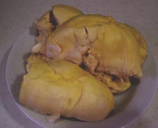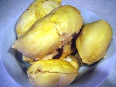 | 皮が柔らかいので、出刃包丁がスゥ〜〜〜と入るのがこのあいだと違って、すごくうれしい! 味は あのとろ〜〜りとしたクリーミーなドリアンだったのです。 ♪うれしいな〜〜〜♪ においは、あまり強くなかったけど、それでも、ああ幸せ〜〜〜という気分がしました。 ダンナとふたりで仲良く半分づつ食べました。 |